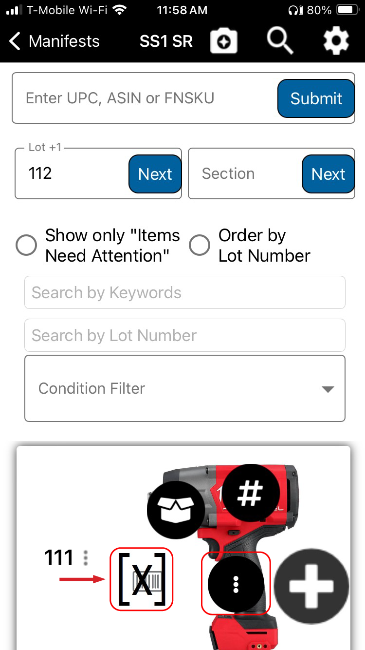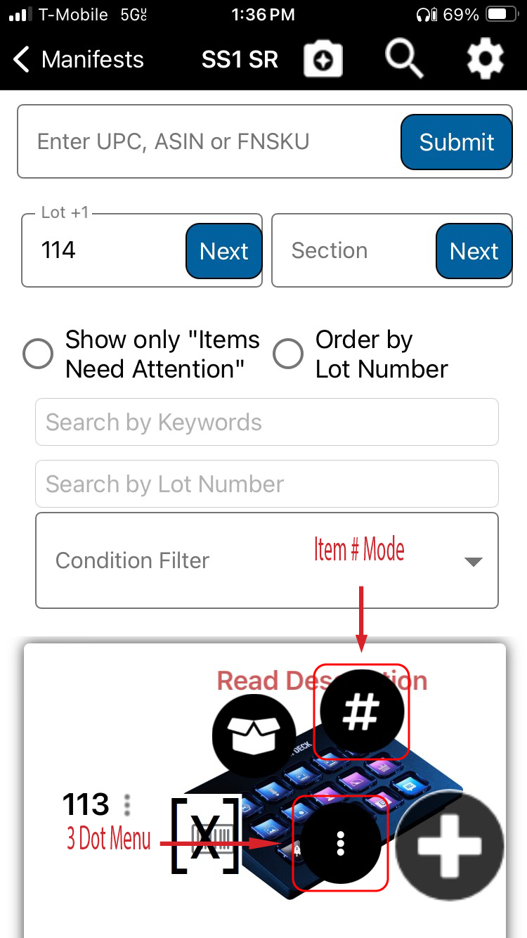 Item # (Number) Mode – Use vendor-specific or warehouse item numbers. Also used when scanning Amazon LPNs & Items from an Uploaded Manifest (see Uploading a Manifest)