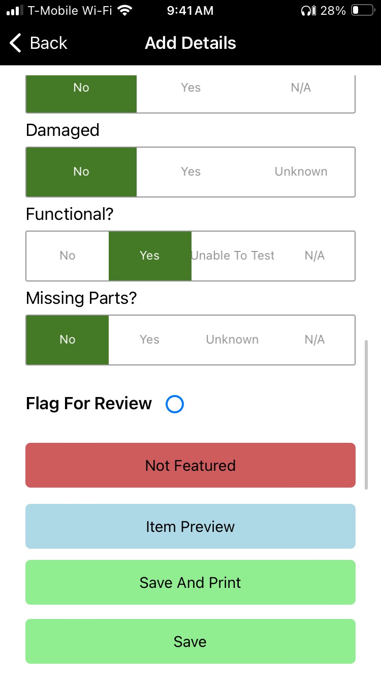 - Note: you may add a "Missing Parts Description" in a field that opens if you click "Yes" to Missing Parts.