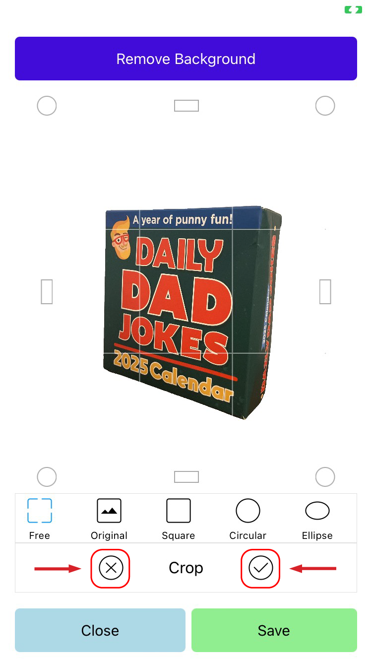 Photo Crop requires you to tap the "Check Mark" to confirm. Or you can Delete. Pictured below.