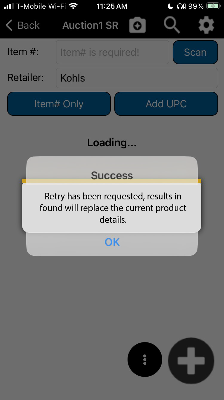 If you have scanned an item but it has not pulled information you can quickly click the "Retry" option to have manyfastscan find it with the following options: