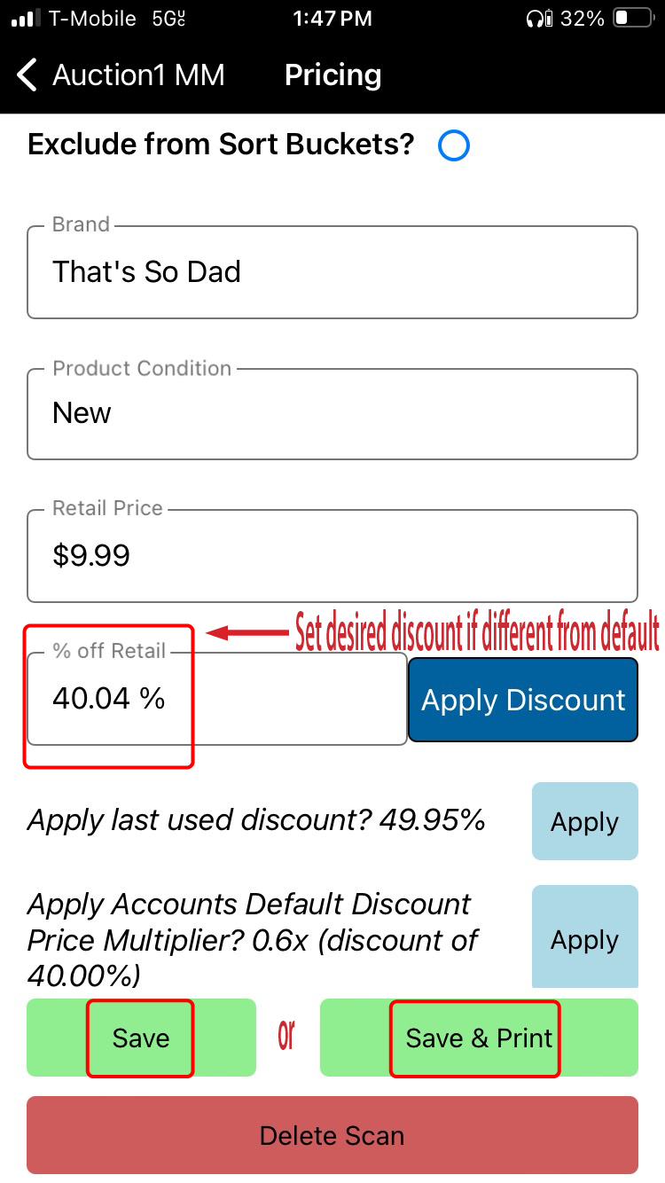 If you want a discount different from your default, enter it in % off Retail and tap Apply Discount.