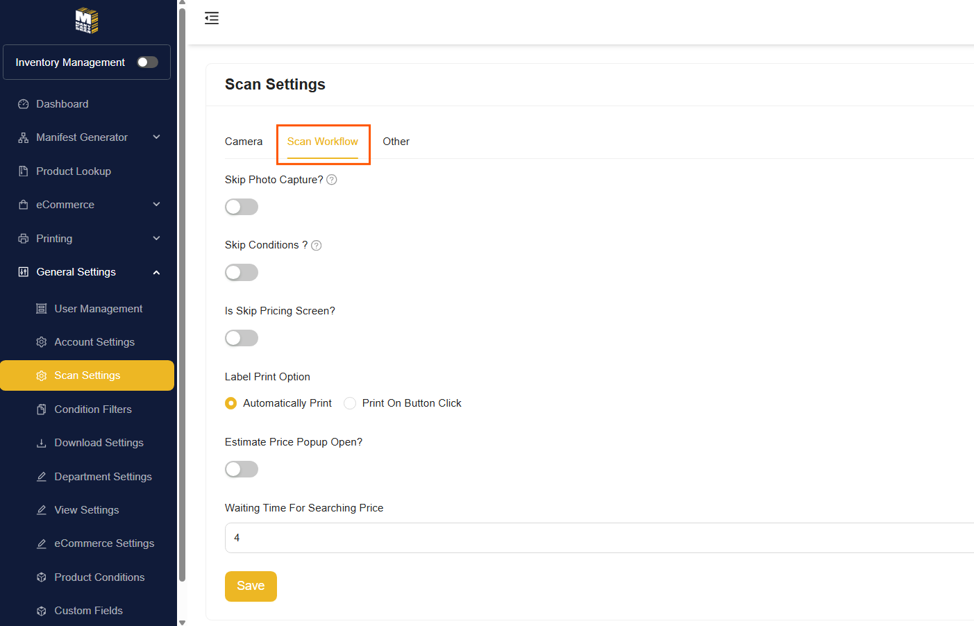 Turn on Pricing Screen in Scan Settings - How To Step 1. When you login to manyfastscan, you will be on the Dashboard. Step 2. Click on the 3 bar menu in the upper left hand corner of the screen. Step 3. Select "General Settings" then "Scan Settings" ...