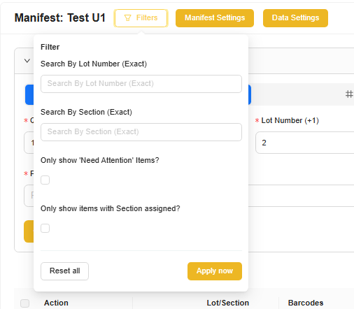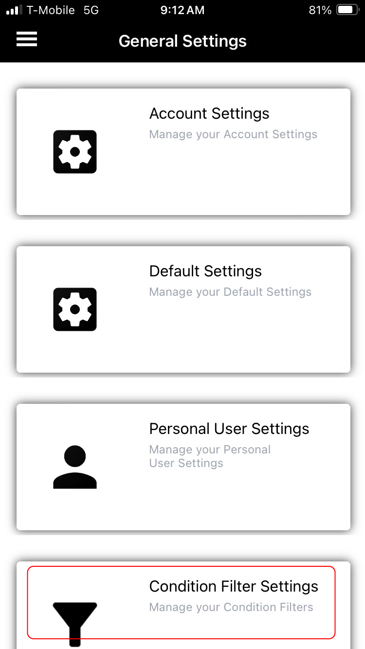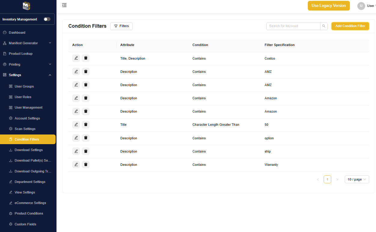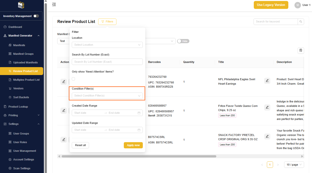 The Condition Filter can be used in the Review Product List page or on the Manifest Page