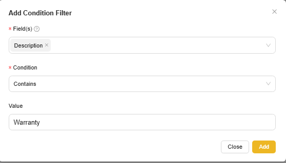 This example will only show you items which have 'Warranty' in the Description field. However, for this example, manyfastscan's AI automatically cleanses the Description field for any mention of 'Warranty' or 'Guarantee'