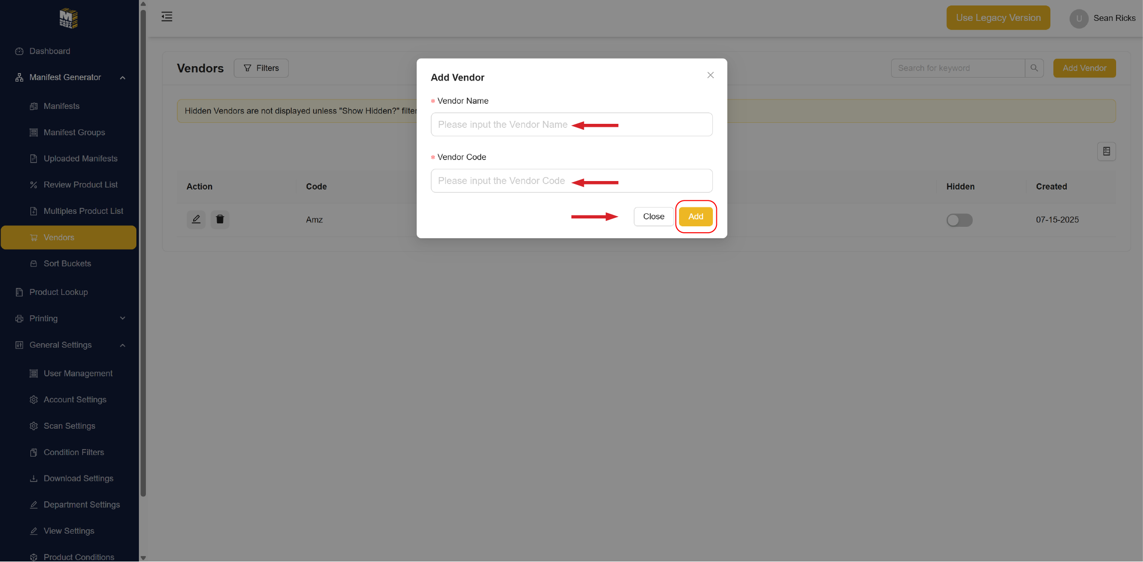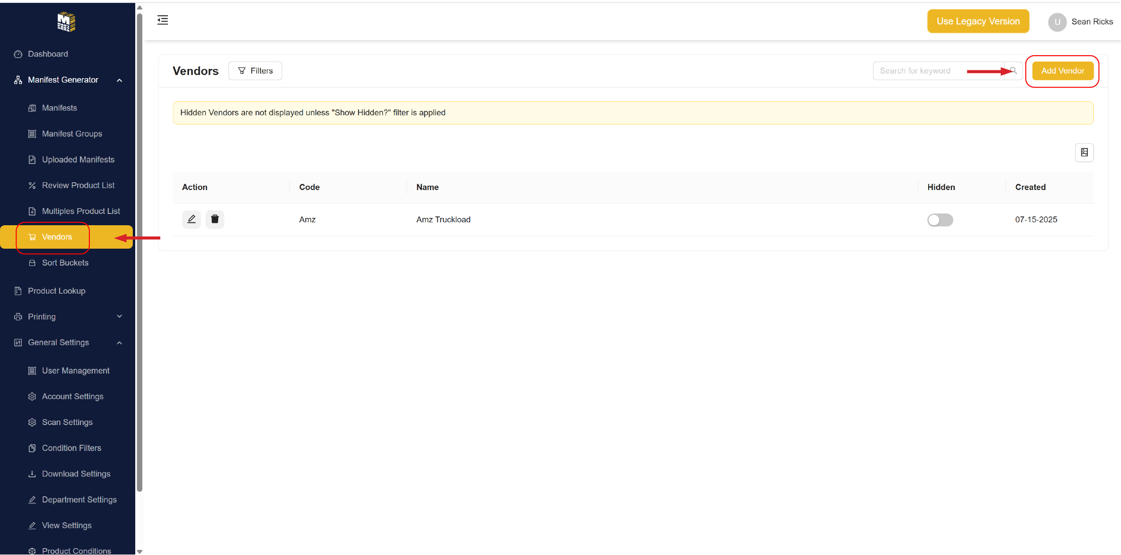 The Vendors section allows you to create and manage Vendor profiles for use in manifests. These profiles help you organize and track inventory sources truckloads, liquidation suppliers, retailers, etc.