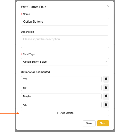3. Single Select, Multi Select, and Option Button fields require you to add options, by clicking the 'Add Option Button'. Each option added, will be presented to the user.