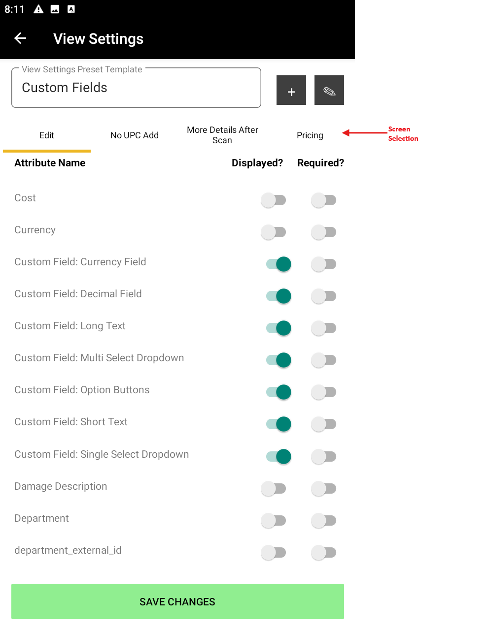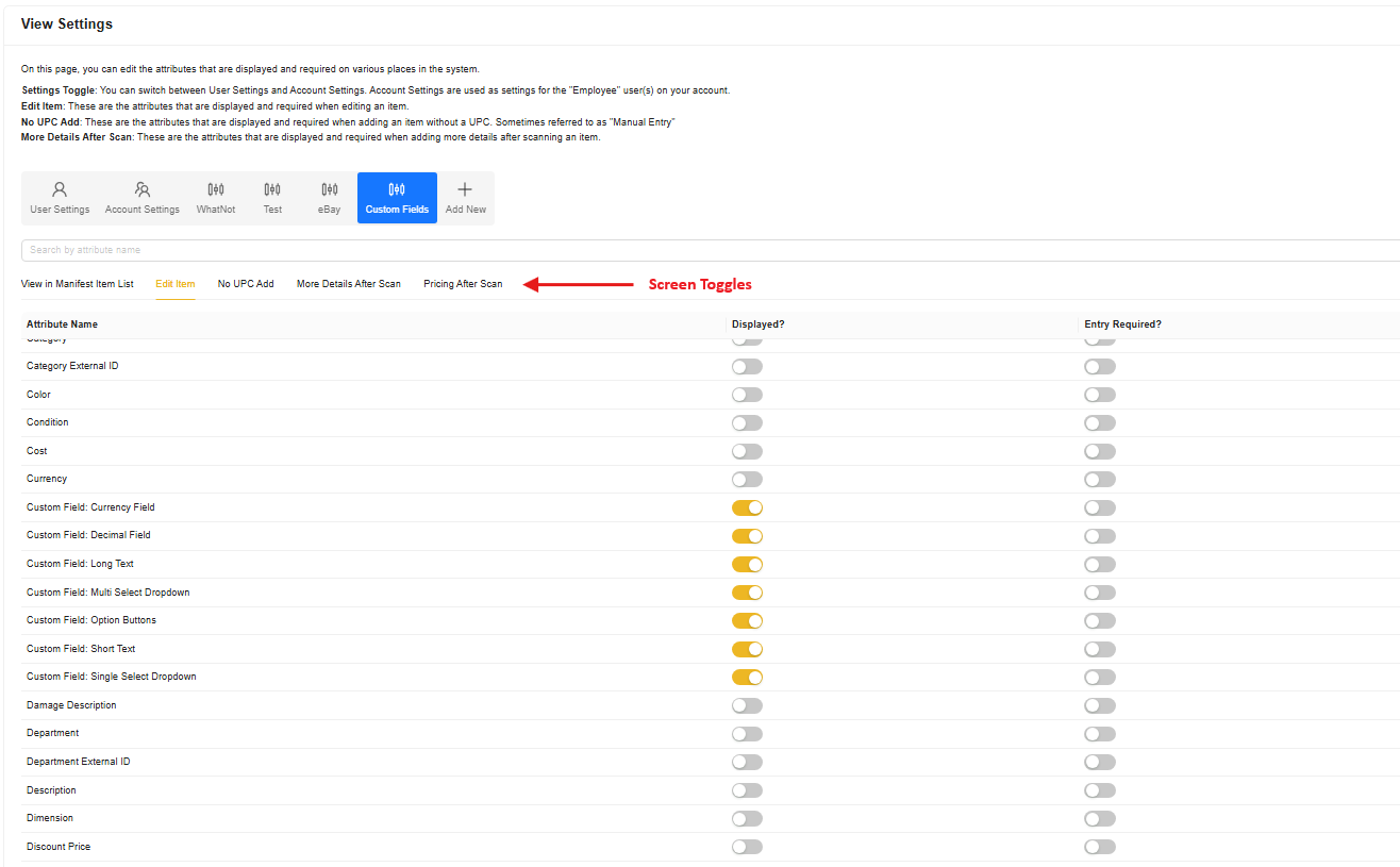 When a Custom Field is created, it will show in the General Settings > View Settings with the prefix "Custom Field". Custom Fields can be added to each of the Screens (which can be toggled at the top)