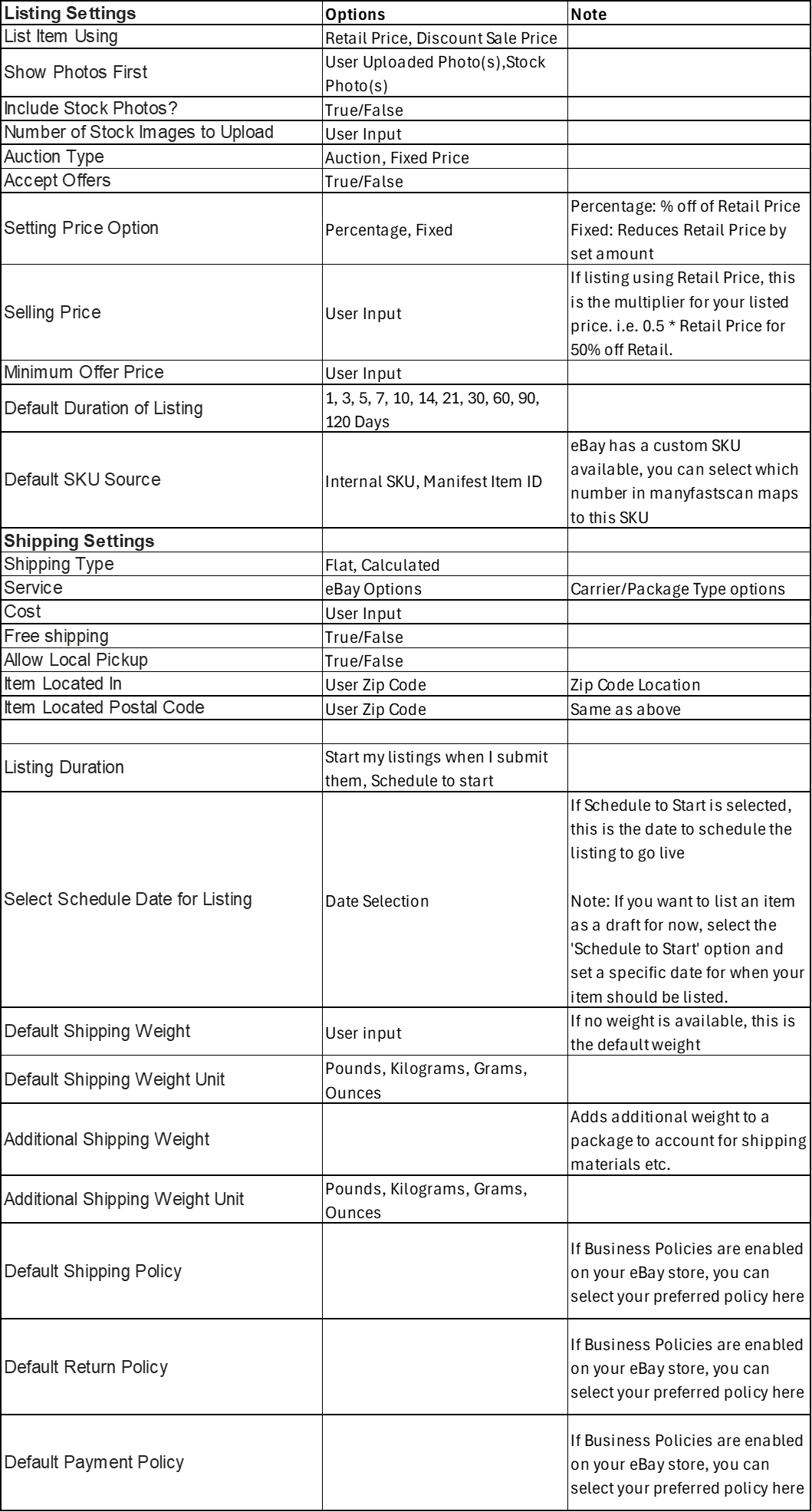 When List All/List Selected is chosen, manyfastscan will check if the eBay required fields are populated and valid.