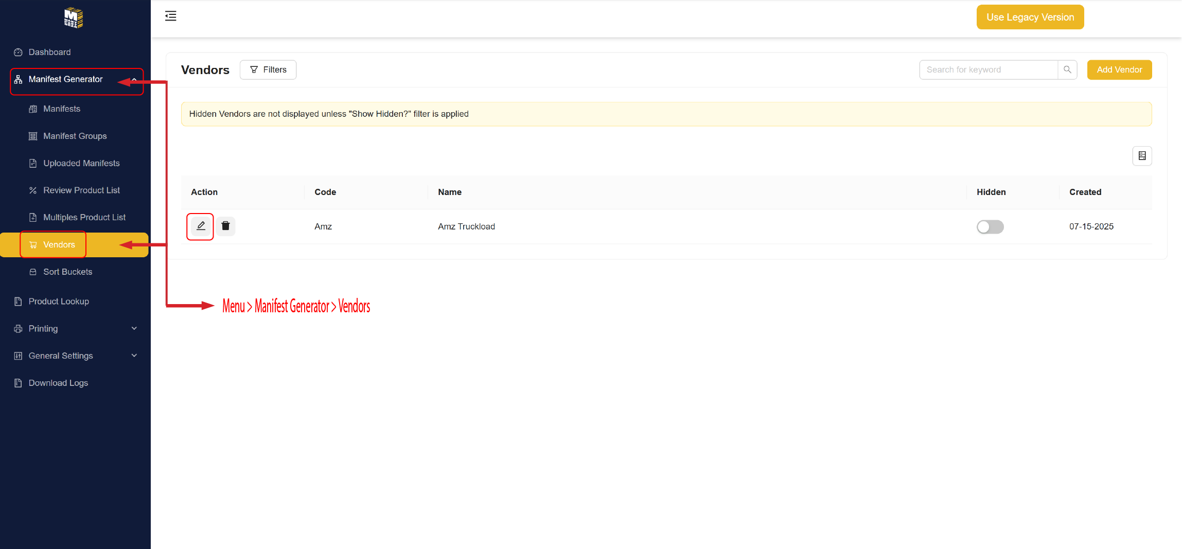 How to Create a New Vendor Menu > Manifest Generator > Vendors Overview The Vendors section allows you to create and manage Vendor profiles for use in manifests. These profiles help you organize and track inventory sources truckloads, liquidation ...
