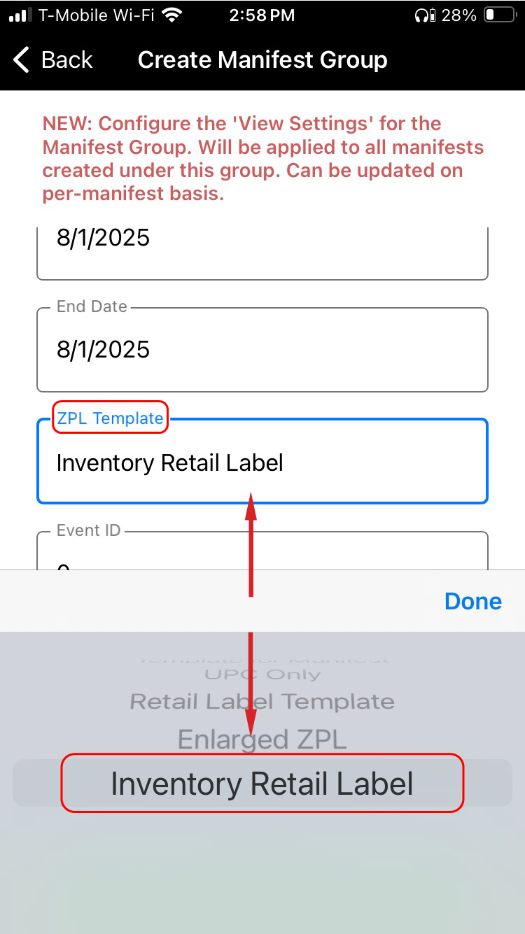 There is a process to change your label template to Inventory, which starts when you are creating your Manifest Group.