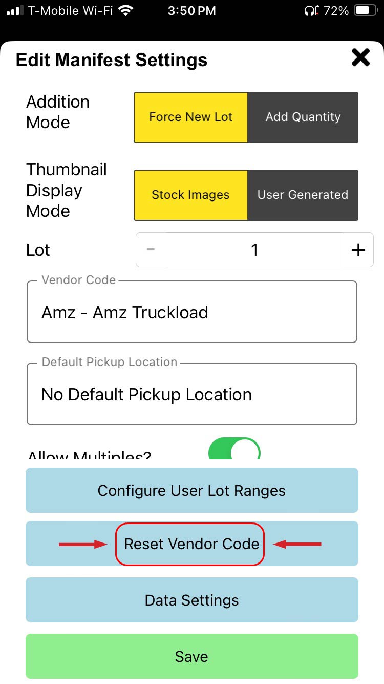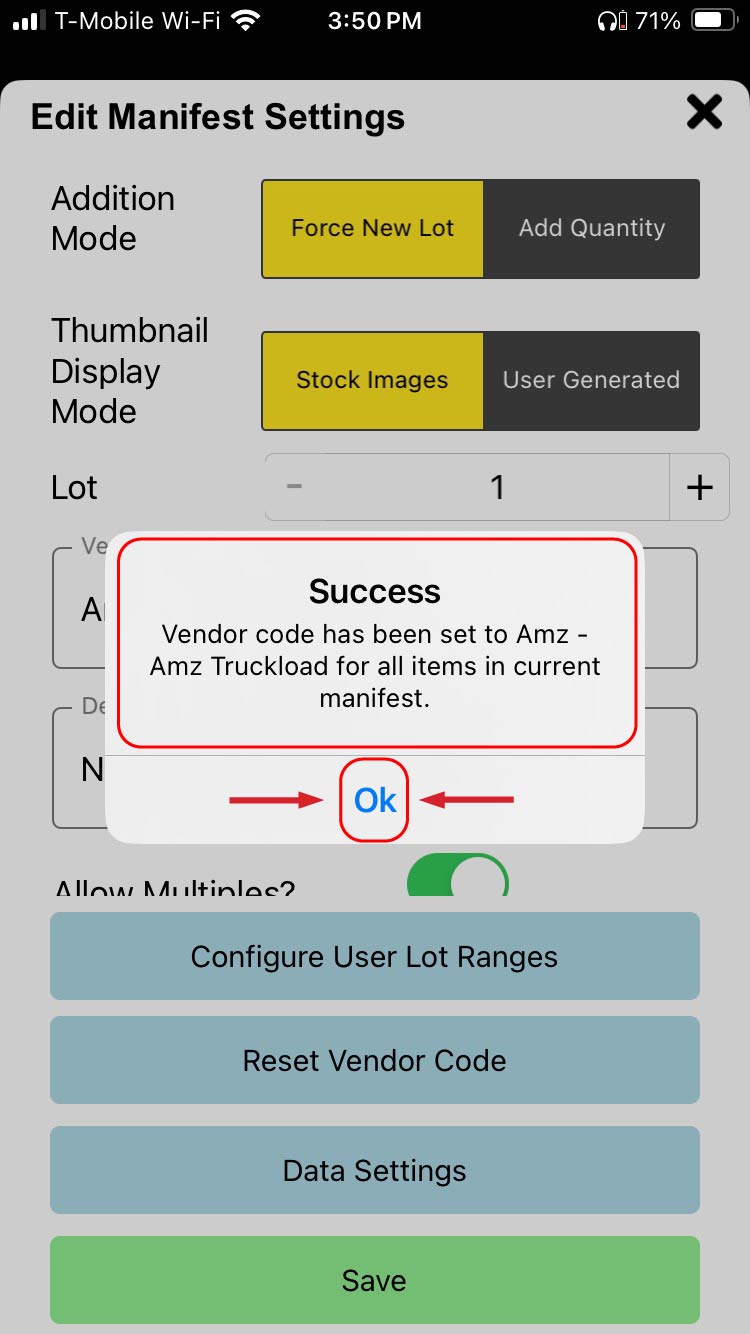 Step 4. Success Message: You will receive a success message confirming you have reset the vendor code for all items in your Manifest.