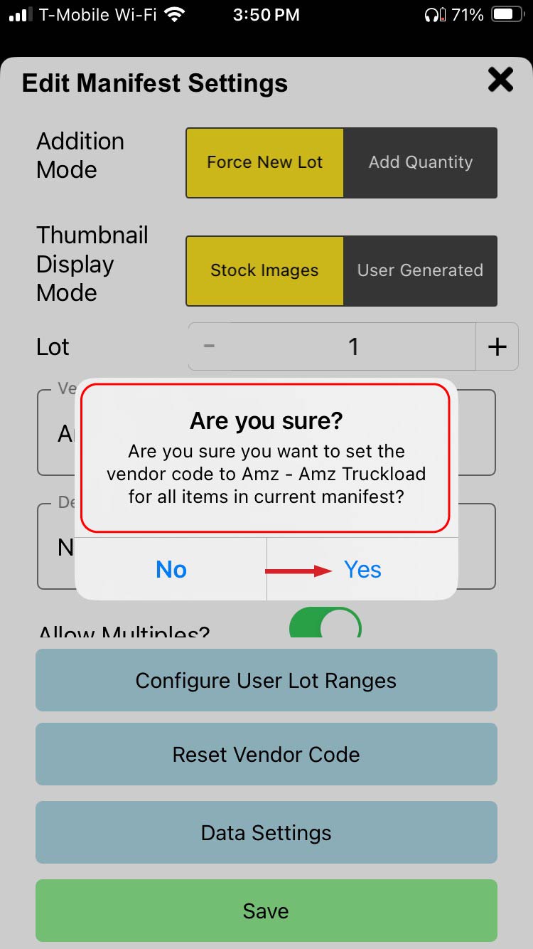 Step 3. Warning Message: This warning asks if you are certain you want to reset the vendor code for all items in your Manifest.