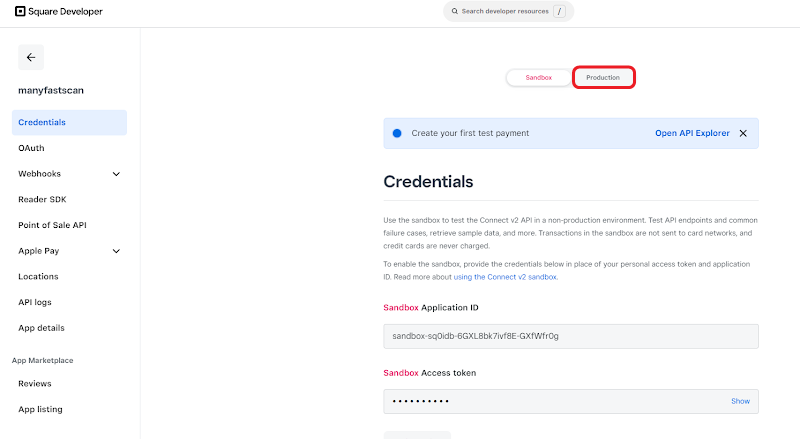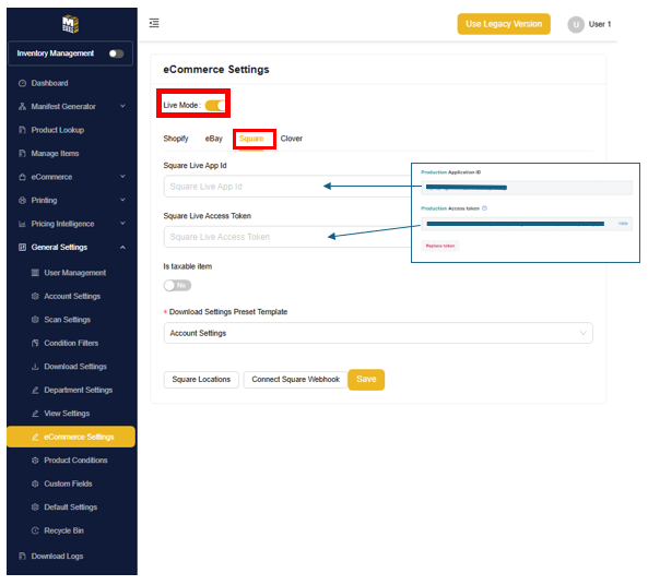 Step 6. Go to eCommerce Settings in manyfastscan and turn on live mode.