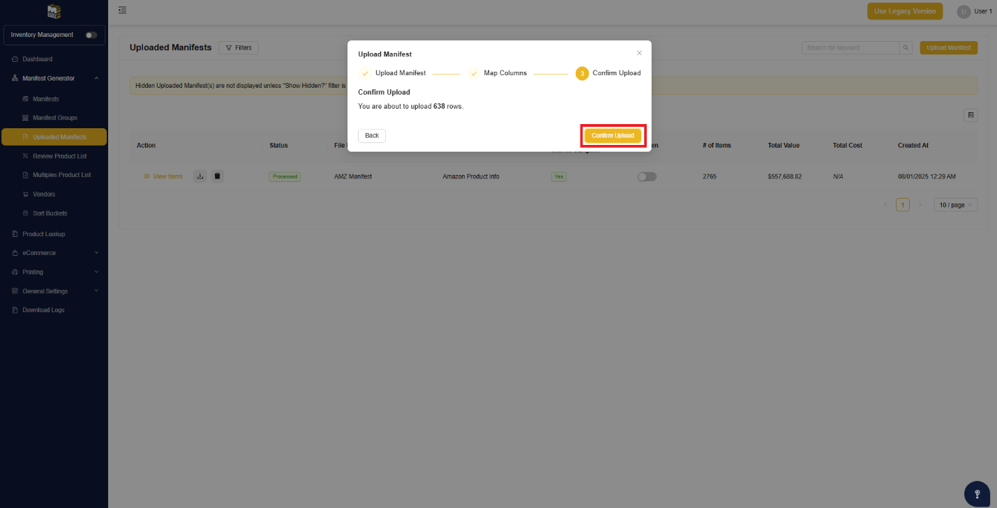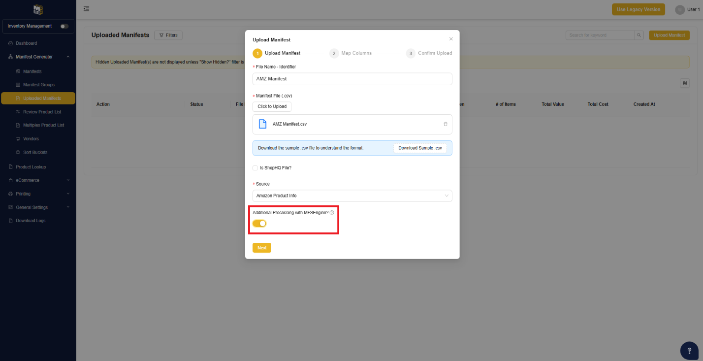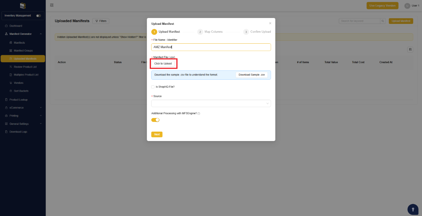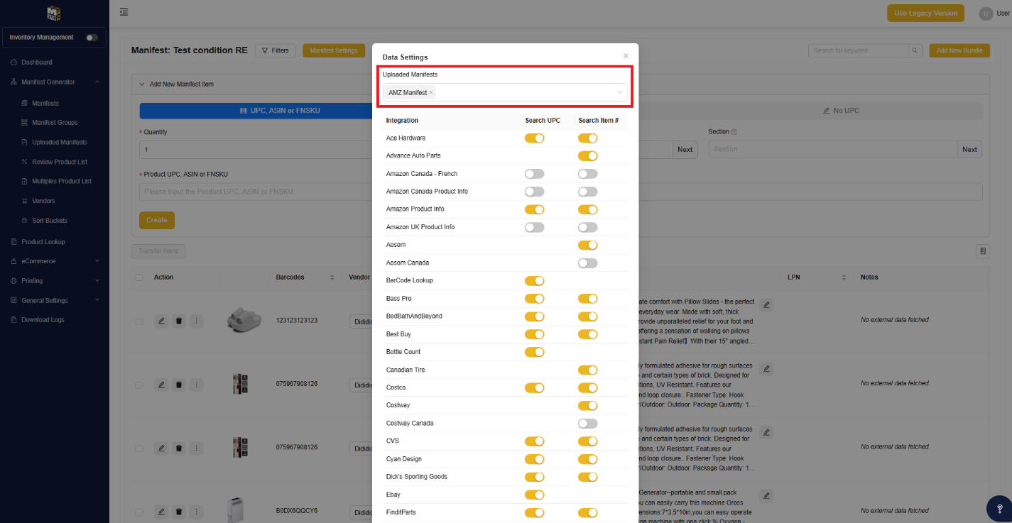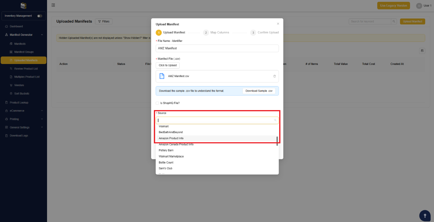 - The Source dropdown is the Retailer who supplied the manifest you want to upload. In this example, we will choose Amazon Product Info and check the last checkbox.