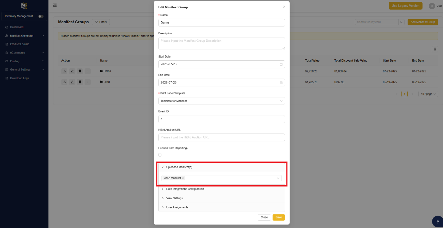 - Scroll down to find a section called Uploaded Manifests. Click the accordion (rectangle) that says ‘Uploaded Manifests’ Here, select the AMZ Manifest from the dropdown menu as a data source for your entire Manifest Group.
