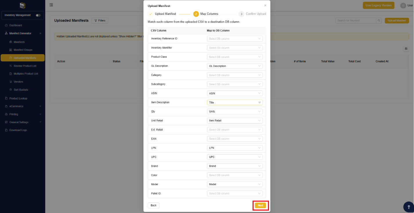 - Click Next. On the left side, you will see all the columns from the CSV and all the database columns in manyfastscan. This is where you map the data from the CSV into manyfastscan. For Amazon, avoid mapping any UPCs as they are often incorrect. The required fields are ASIN Item Description, unit cost, total cost, LPN, and FNSKU.
