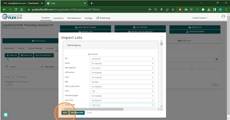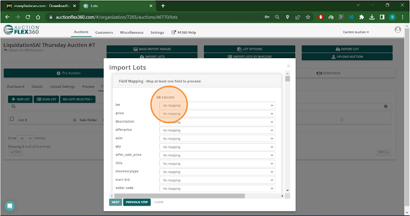 Step 5. Map the fields from the .csv file (on the left, to the fields in Auction Flex 360 (Dropdowns).
