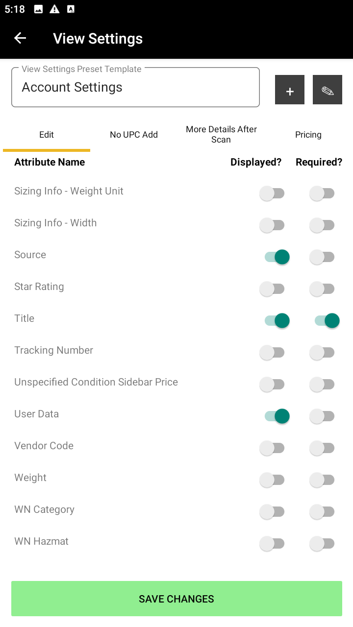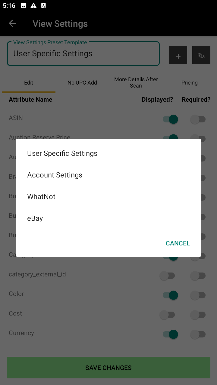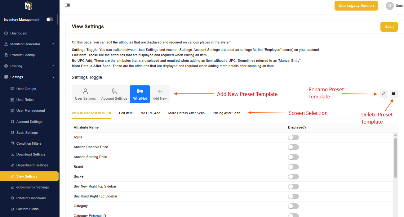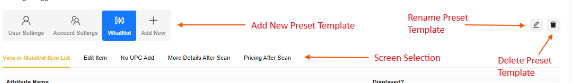 Each View Preset Template will have its own set of fields selected to be shown to the user for cataloguing. The default template is 'Account Settings'. The 'User Settings' template is unique to the user who is logged in and useful for ad-hoc scenarios.