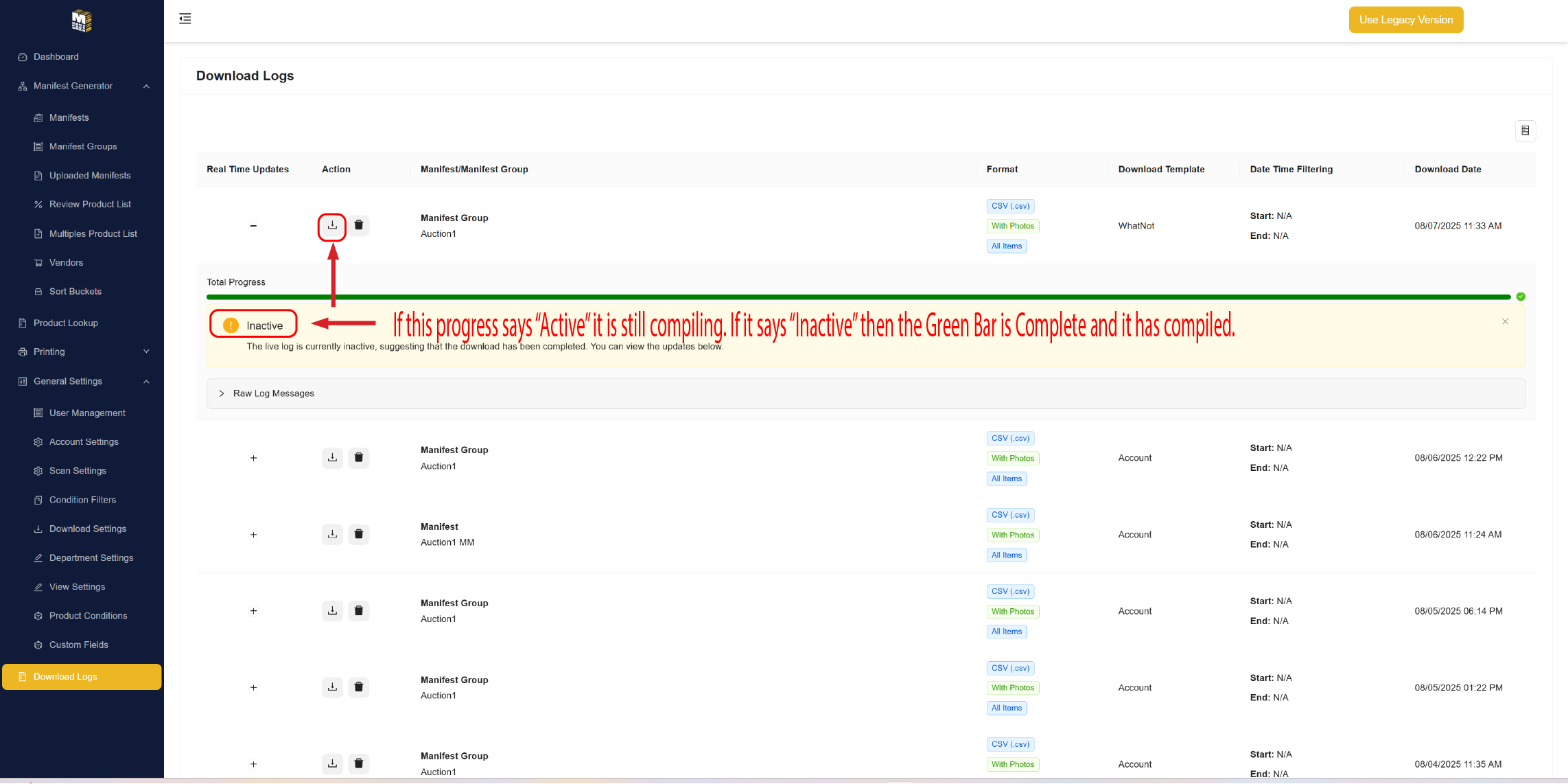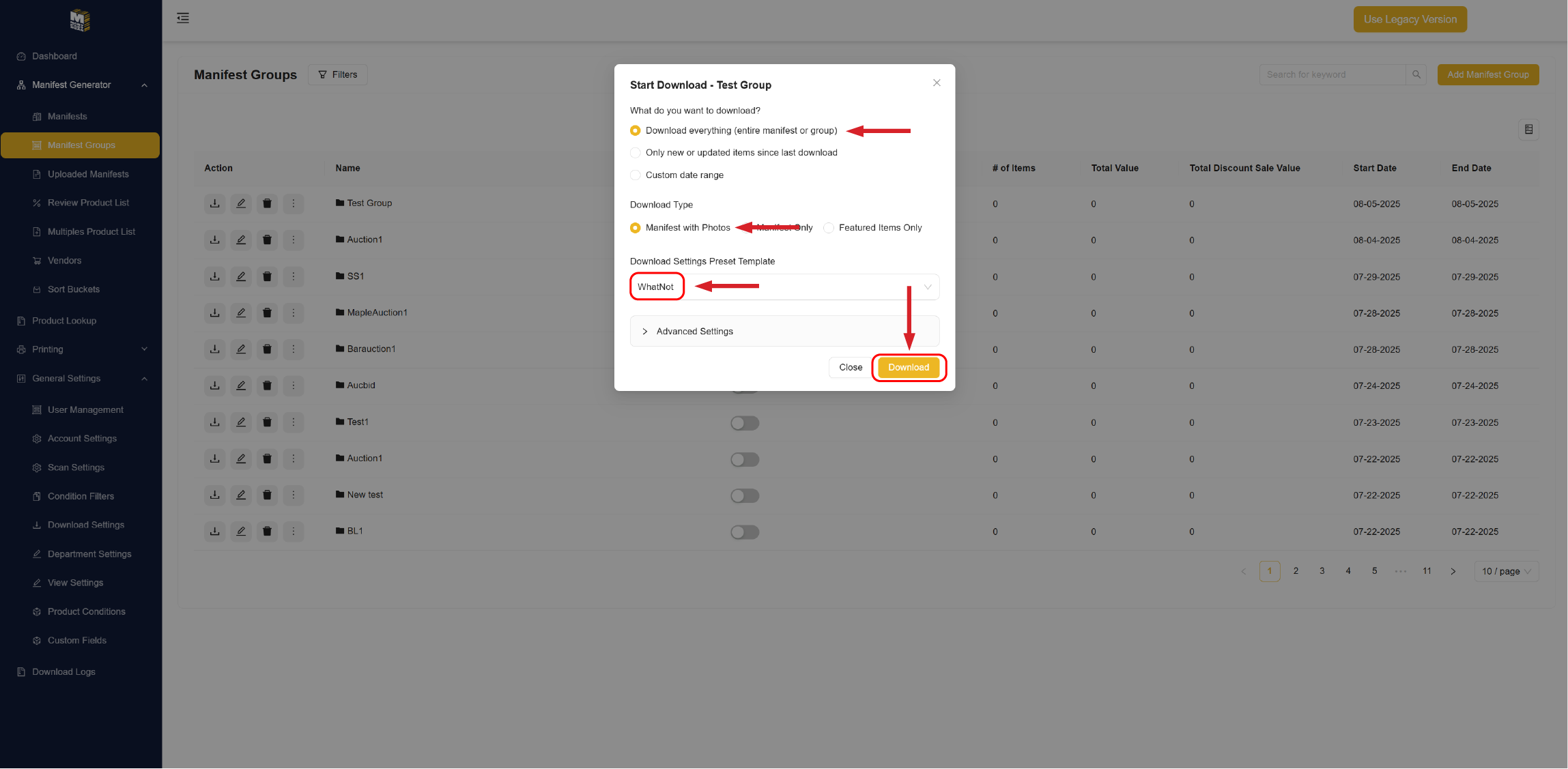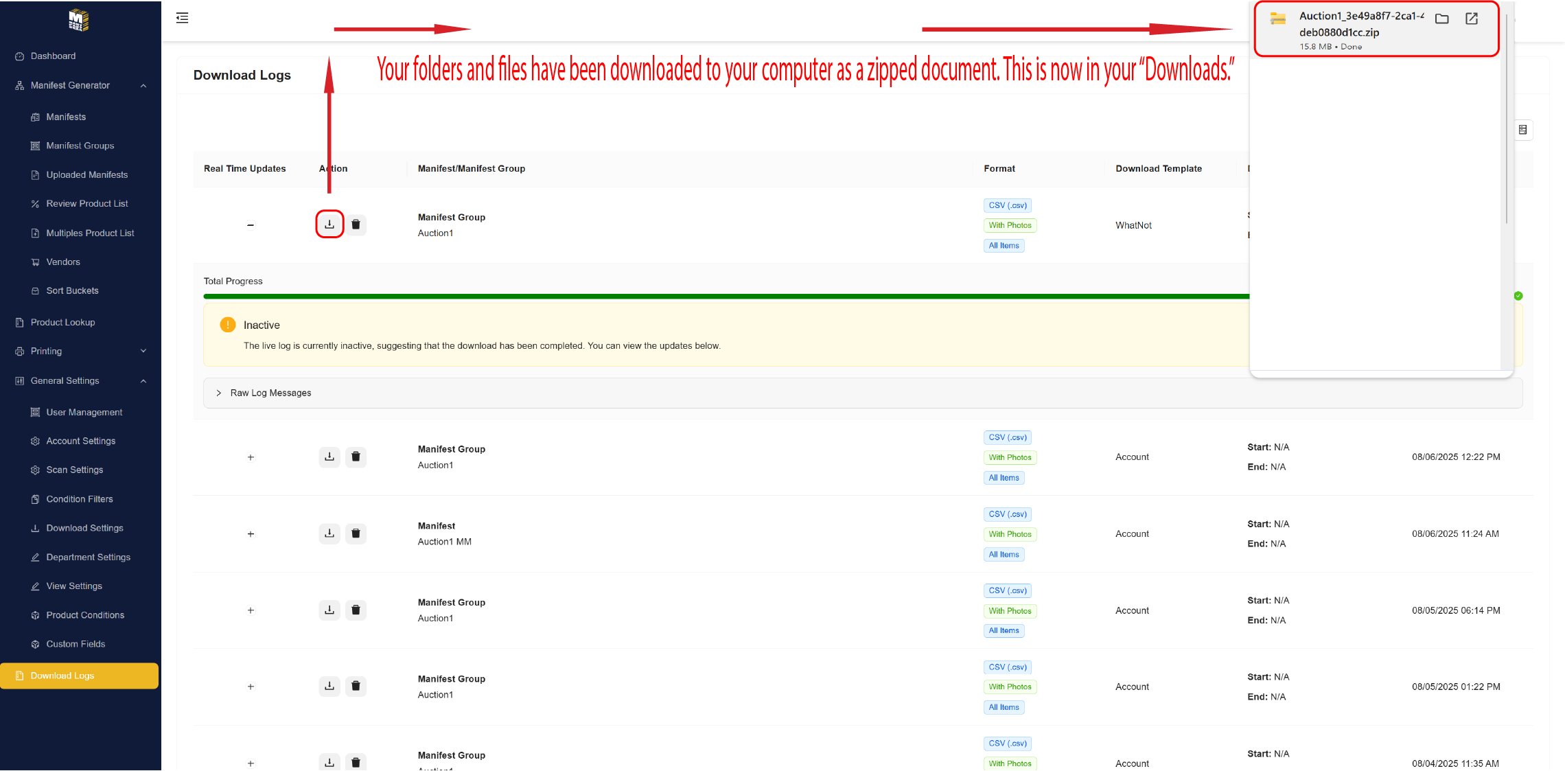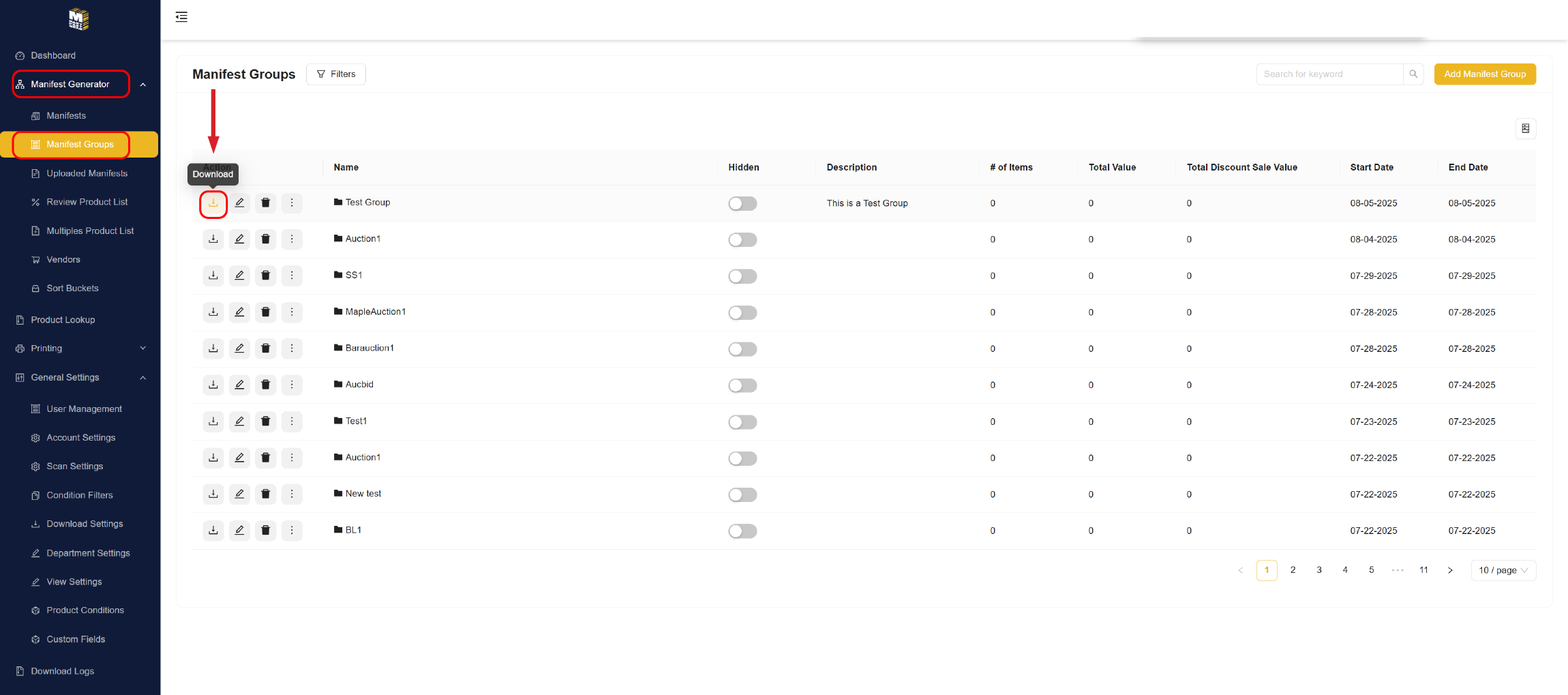 - Click on the "Download" icon to the left of your selected Manifest Group