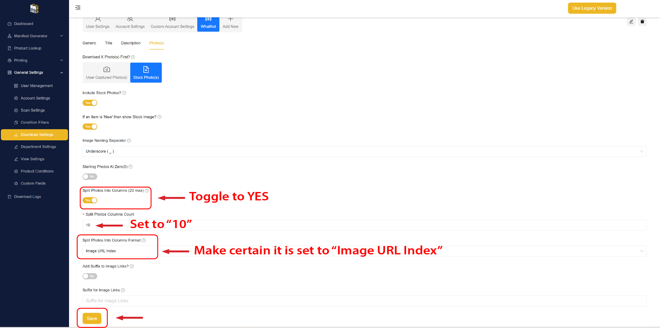 - Toggle to YES: "Split Photos Into Columns" - Set field below to 10.